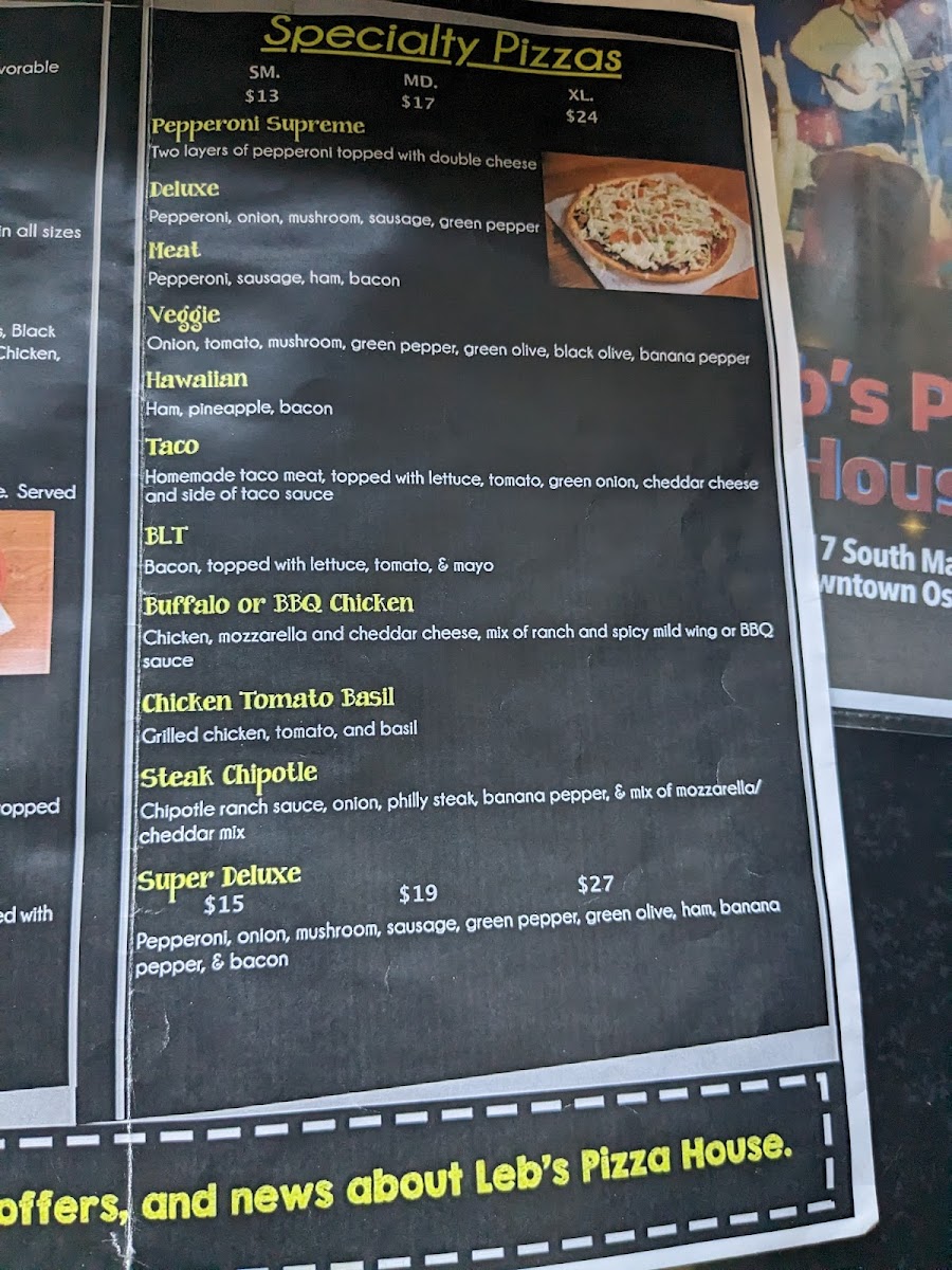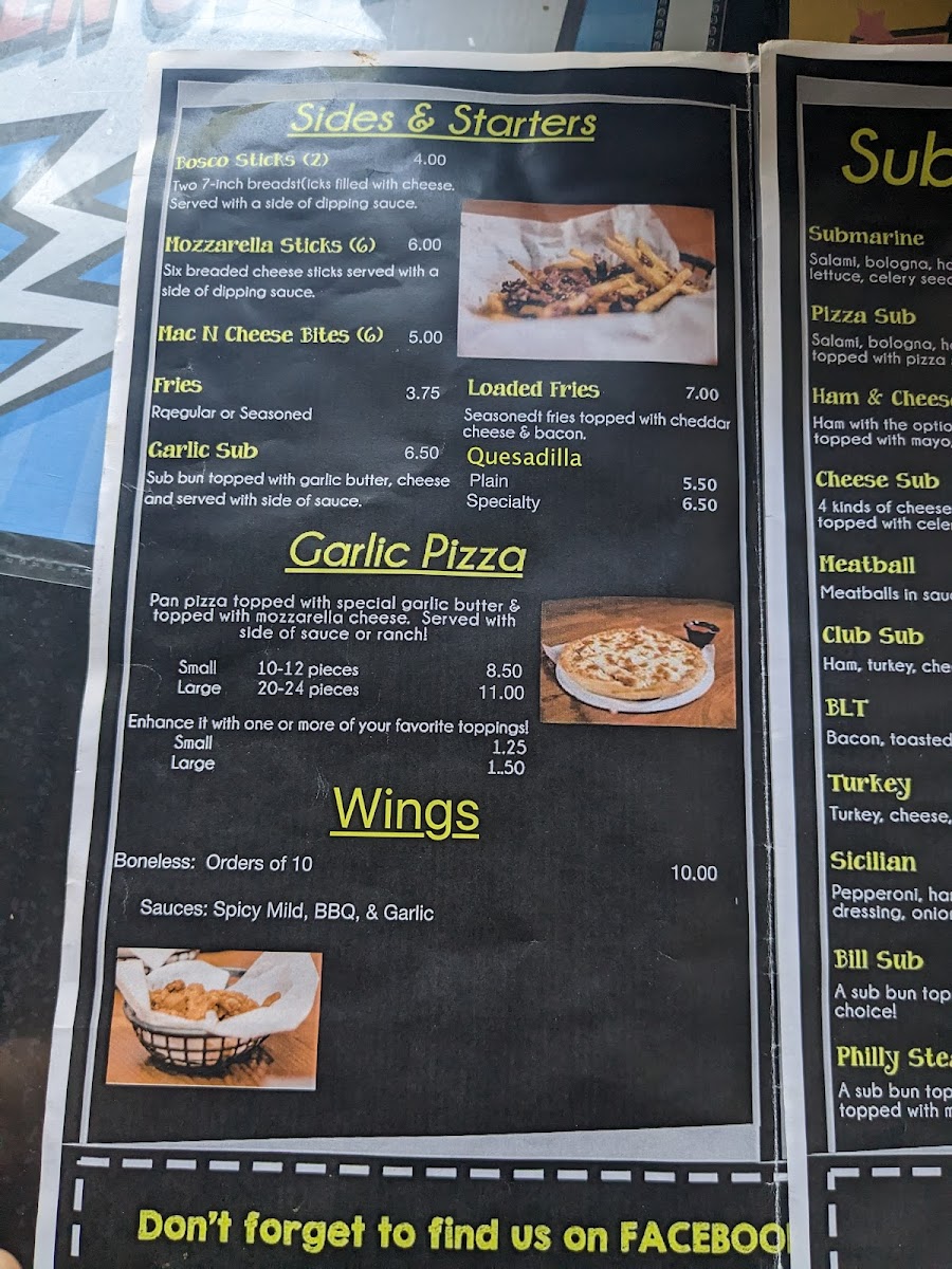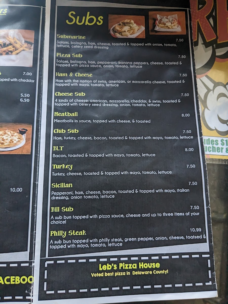 The menu at Leb's Pizza House offers a solid mix of classic comfort foods and hearty pizza options that cater to a variety of tastes. For starters, the Bosco Sticks, Mozzarella Sticks, Mac N Cheese Bites, Fries, and Garlic Sub provide satisfying bites that are perfect for sharing or pairing with a main dish. Pizza lovers will find the Specialty Pizzas particularly appealing, with options like the Pepperoni Supreme, Deluxe, MeatVeggie, and Hawaiian, each promising generous toppings and classic flavors. The sandwich selections, including the Submarine, Pizza Sub, Ham & Cheese Sub, and Meatball, offer hearty, flavorful alternatives for those seeking something beyond pizza. Overall, the menu balances indulgent starters, versatile specialty pizzas, and filling subs, making Leb's Pizza House a dependable choice for both casual meals and family-friendly dining.